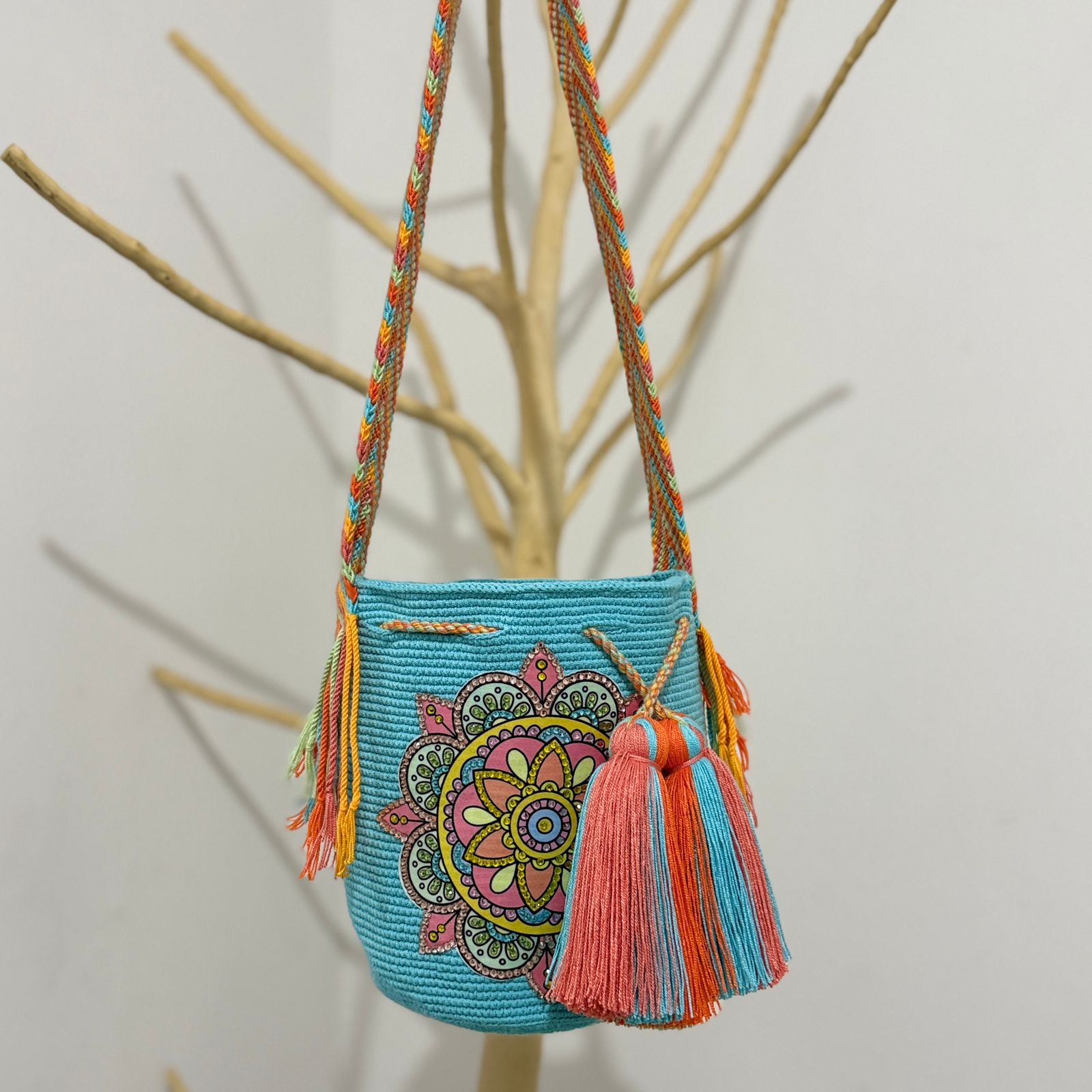Mochila artesanal wayúu. Hecha a mano en la península de La Guajira por indígenas nativos. Producto 100% colombiano y patrimonio cultural de La Guajira. Sus creativos diseños y símbolos representan elementos propios de la naturaleza de la región. Sus medidas son:
