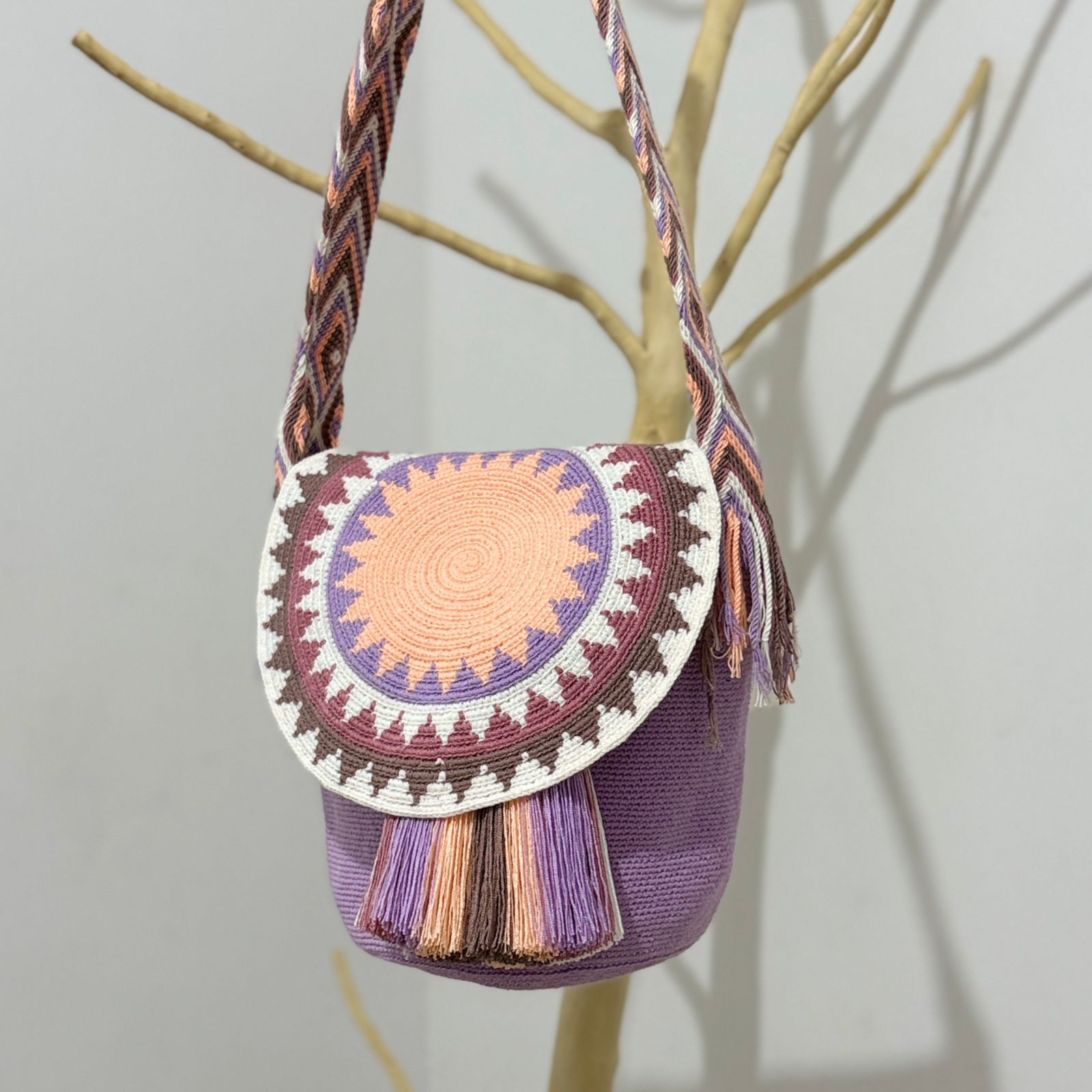Mochila artesanal wayúu. Hecha a mano en la península de La Guajira por indígenas nativos. Producto 100% colombiano y patrimonio cultural de La Guajira. Sus creativos diseños y símbolos representan elementos propios de la naturaleza de la región.