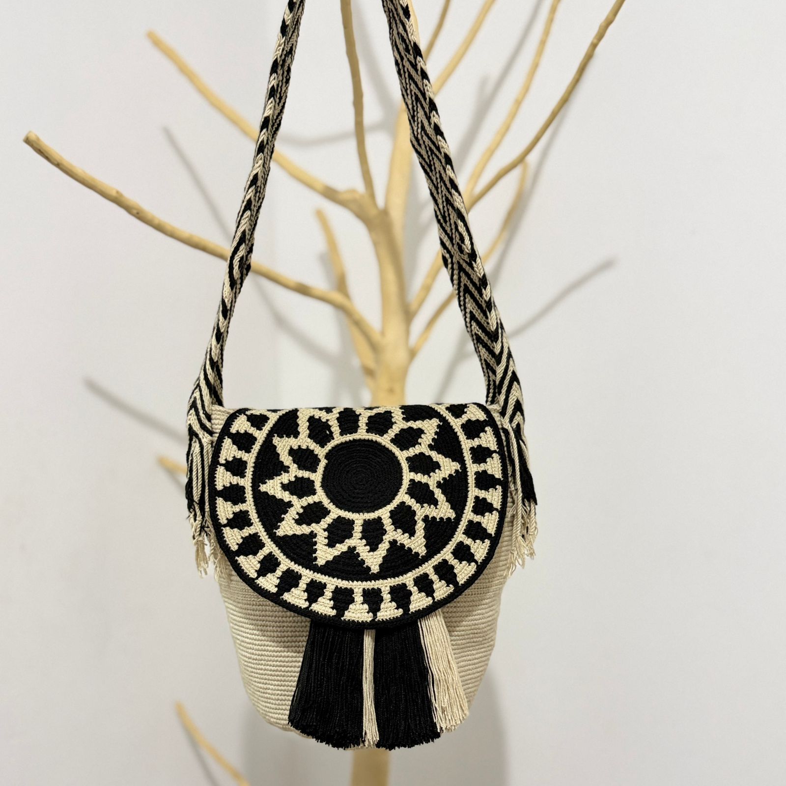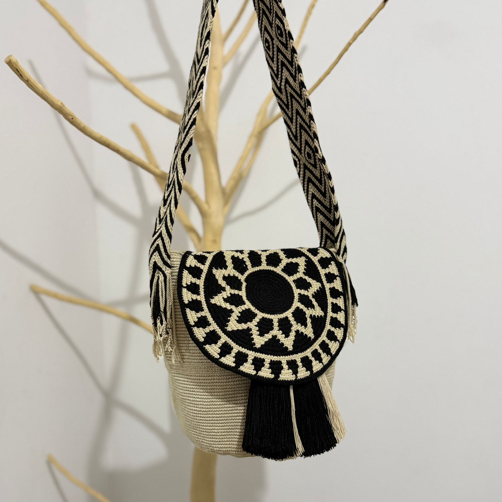 Mochila artesanal wayúu. Hecha a mano en la península de La Guajira por indígenas nativos. Producto 100% colombiano y patrimonio cultural de La Guajira. Sus creativos diseños y símbolos representan elementos propios de la naturaleza de la región.