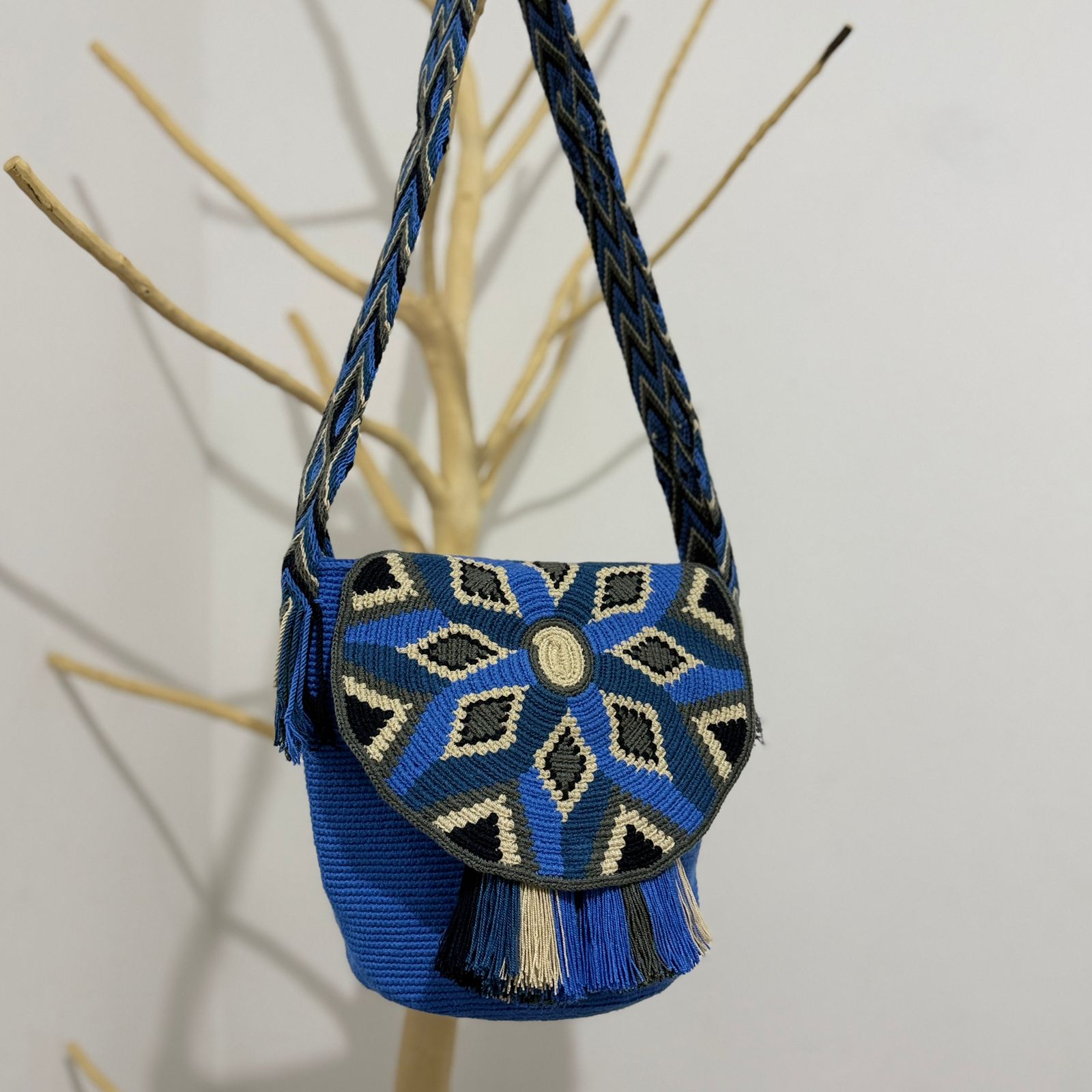 Mochila artesanal wayúu. Hecha a mano en la península de La Guajira por indígenas nativos. Producto 100% colombiano y patrimonio cultural de La Guajira. Sus creativos diseños y símbolos representan elementos propios de la naturaleza de la región.
