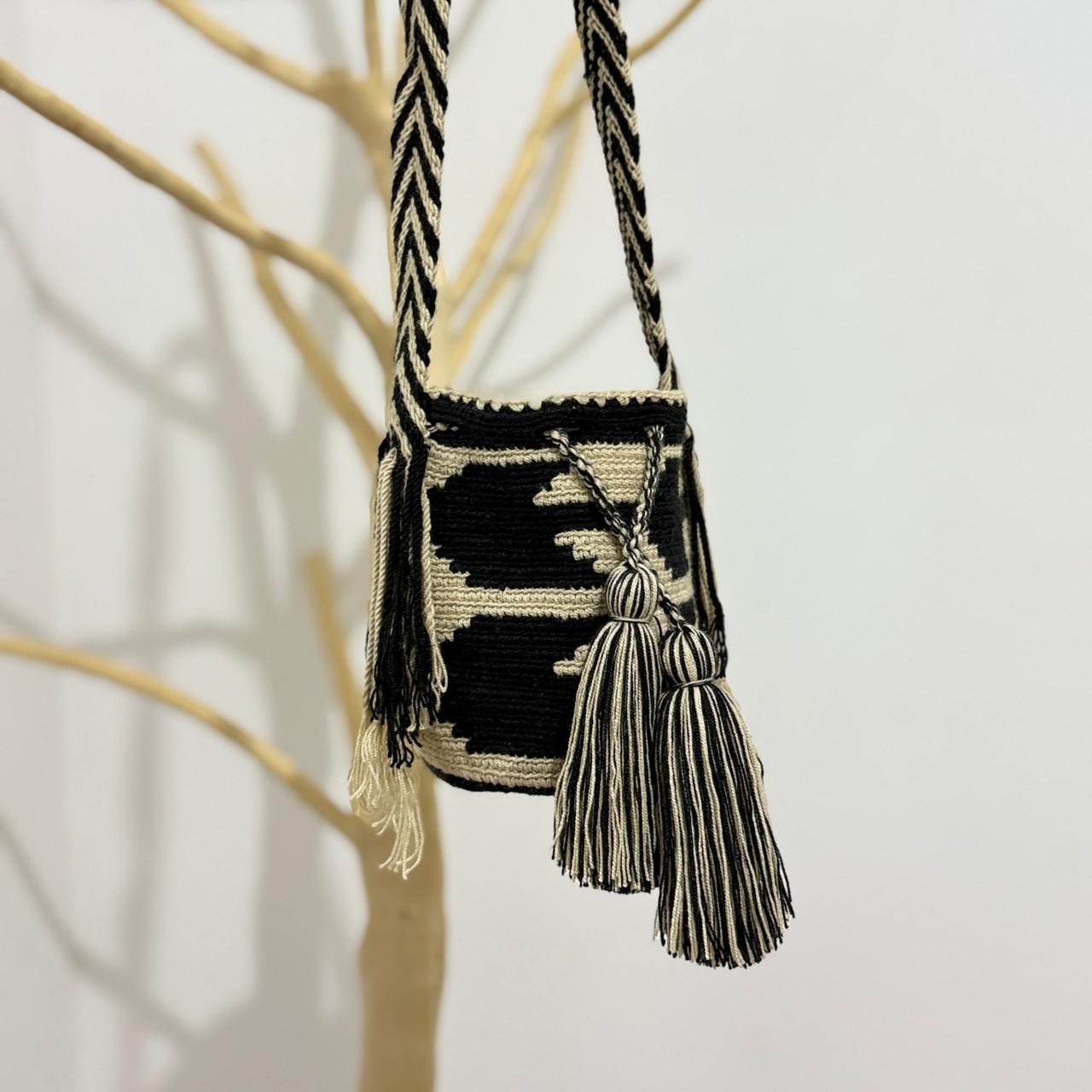 Mochila artesanal wayúu. Hecha a mano en la península de La Guajira por indígenas nativos. Producto 100% colombiano y patrimonio cultural de La Guajira. Sus creativos diseños y símbolos representan elementos propios de la naturaleza de la región.