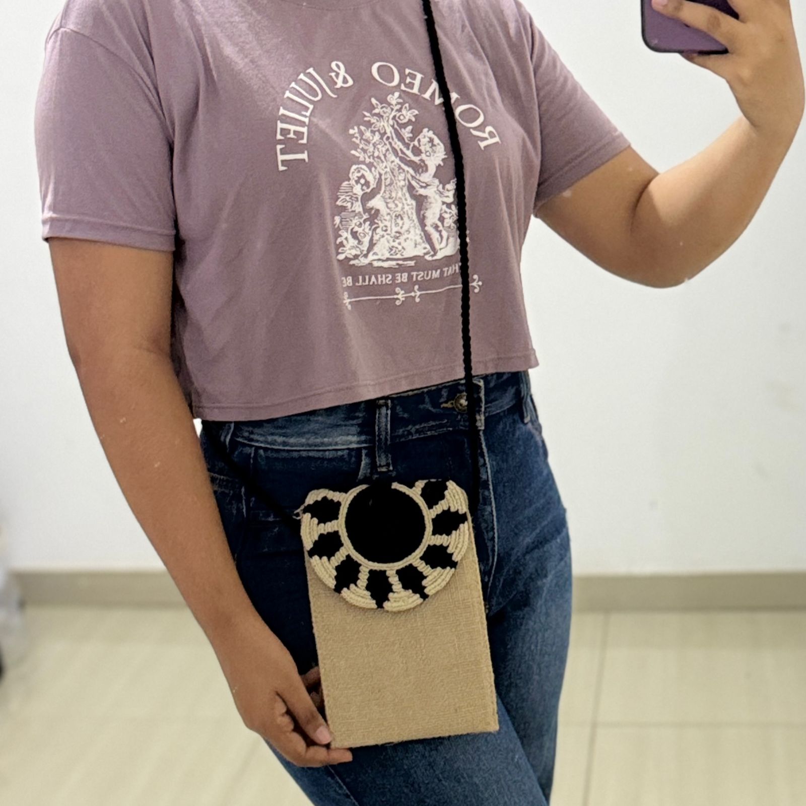 Una pieza que fusiona la resistencia del yute natural con la rica expresión del arte textil Wayuu. Este porta celular ofrece una alternativa de estilo único, combinando texturas orgánicas con la tradición vibrante del tejido de La Guajira.