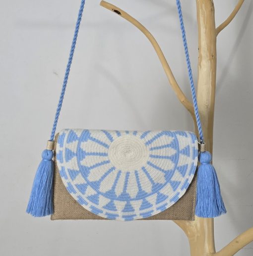 Cartera de mano hecha de yute, adornado con un plato wayuu a manera de tapa. Hecha a mano en la península de La Guajira por indígenas nativos, y posteriormente ensamblado por artesanos Ari juna. Producto 100% colombiano y patrimonio cultural de La Guajira. Sus creativos diseños y símbolos representan elementos propios de la naturaleza de la región.