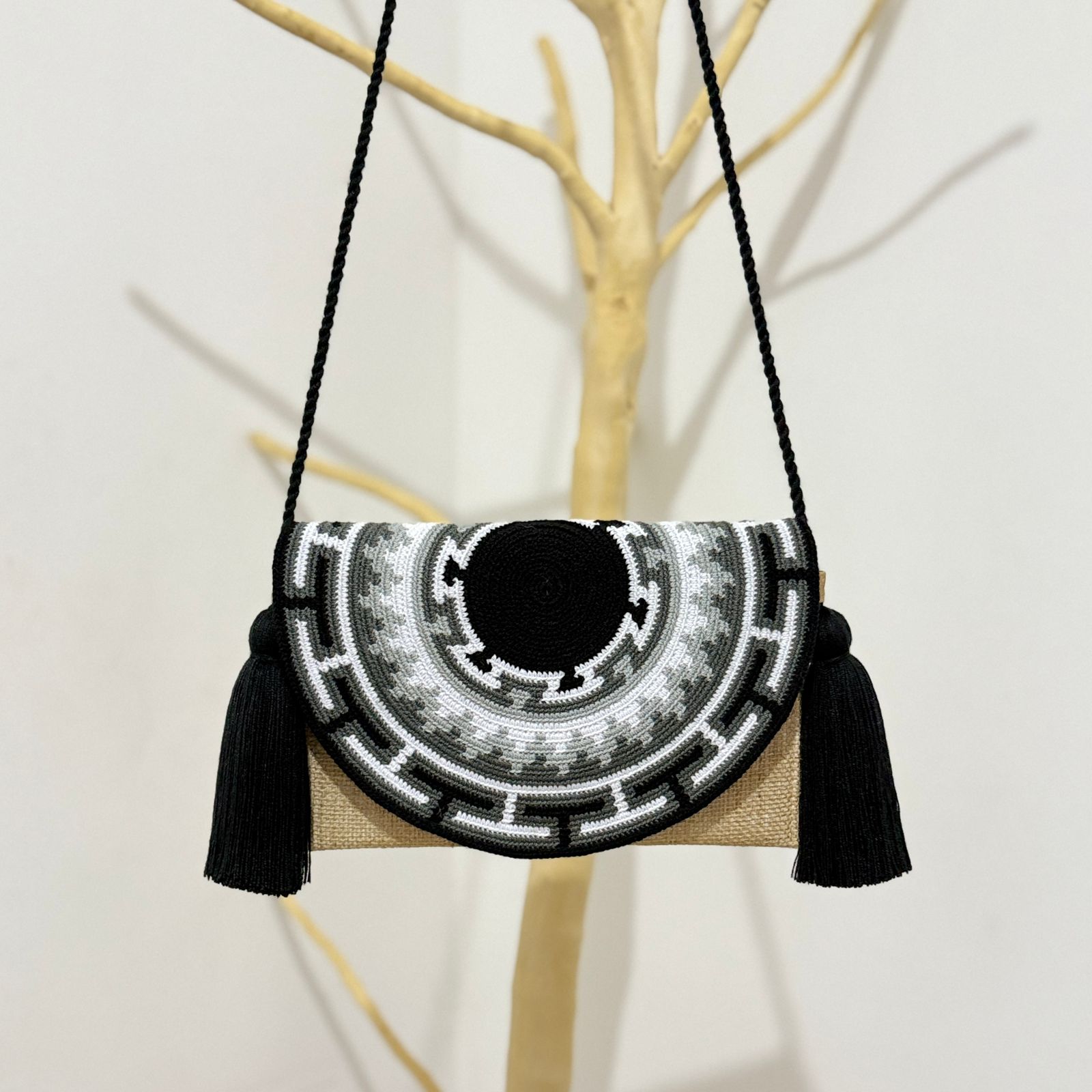 Cartera de mano hecha de yute, adornado con un plato wayuu a manera de tapa. Hecha a mano en la península de La Guajira por indígenas nativos, y posteriormente ensamblado por artesanos Ari juna. Producto 100% colombiano y patrimonio cultural de La Guajira. Sus creativos diseños y símbolos representan elementos propios de la naturaleza de la región.