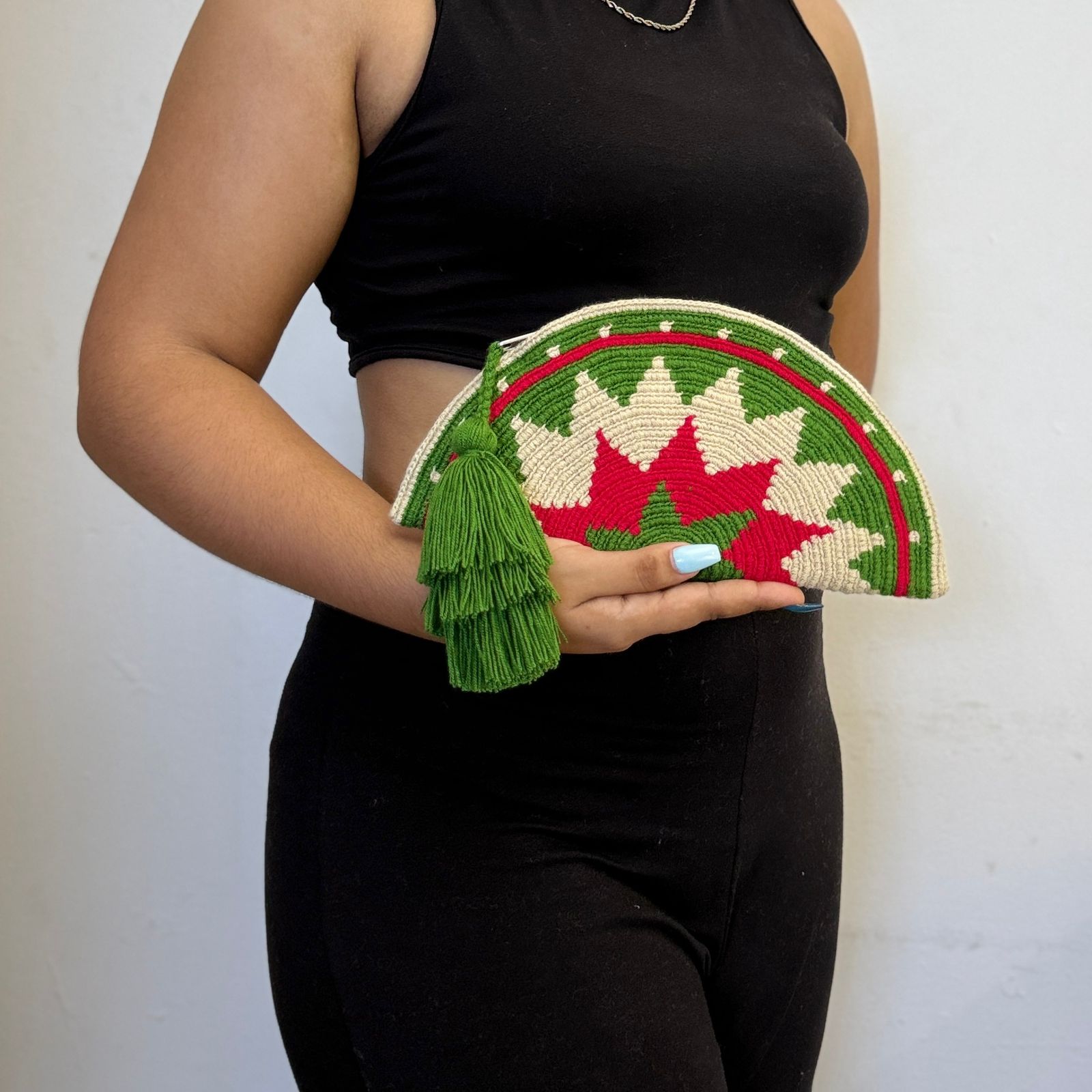 Cartera tejida artesanal Wayúu. Hecha a mano en la península de La Guajira por indígenas nativos. Producto 100% colombiano y patrimonio cultural de La Guajira. Sus creativos diseños y símbolos representan elementos propios de la naturaleza de la región.
