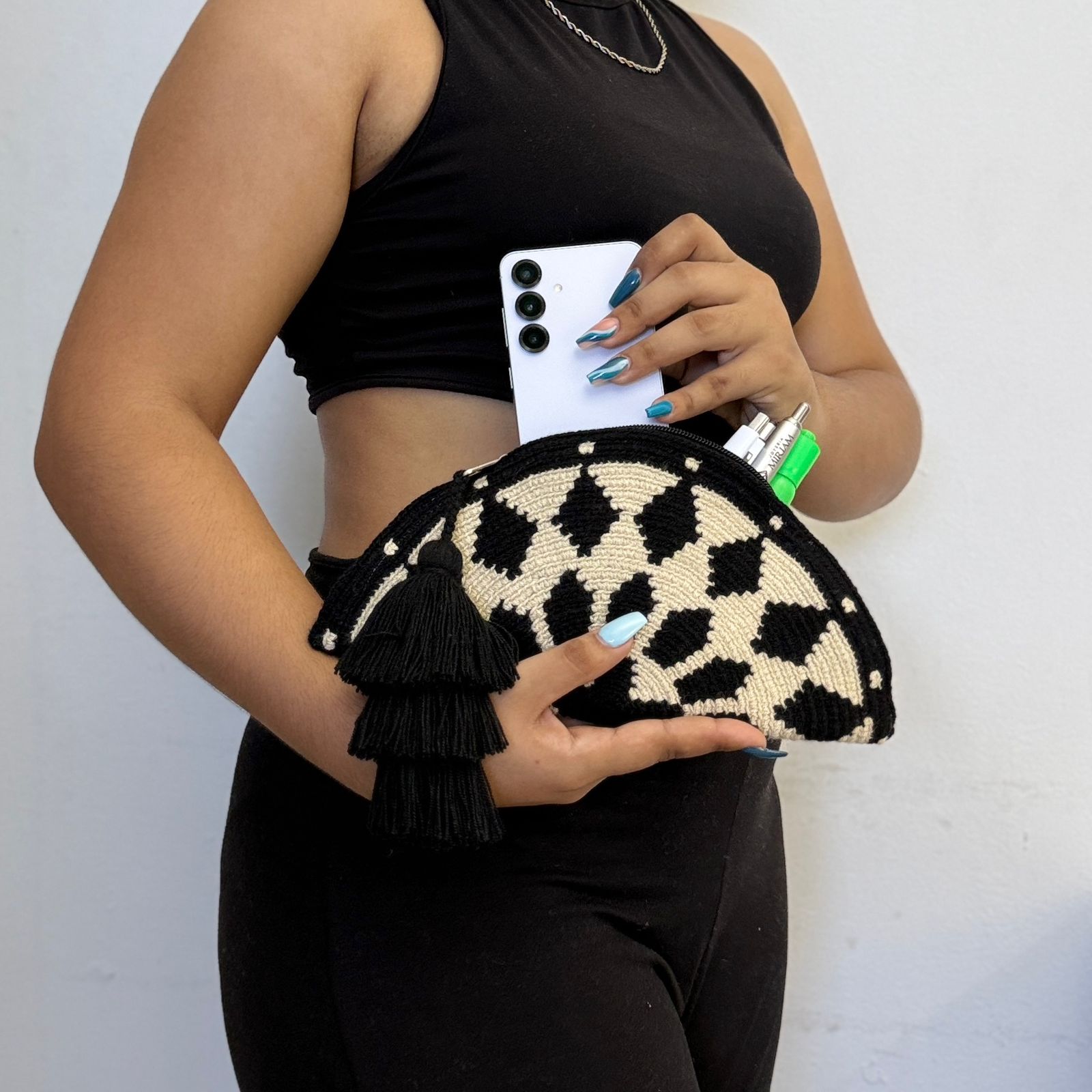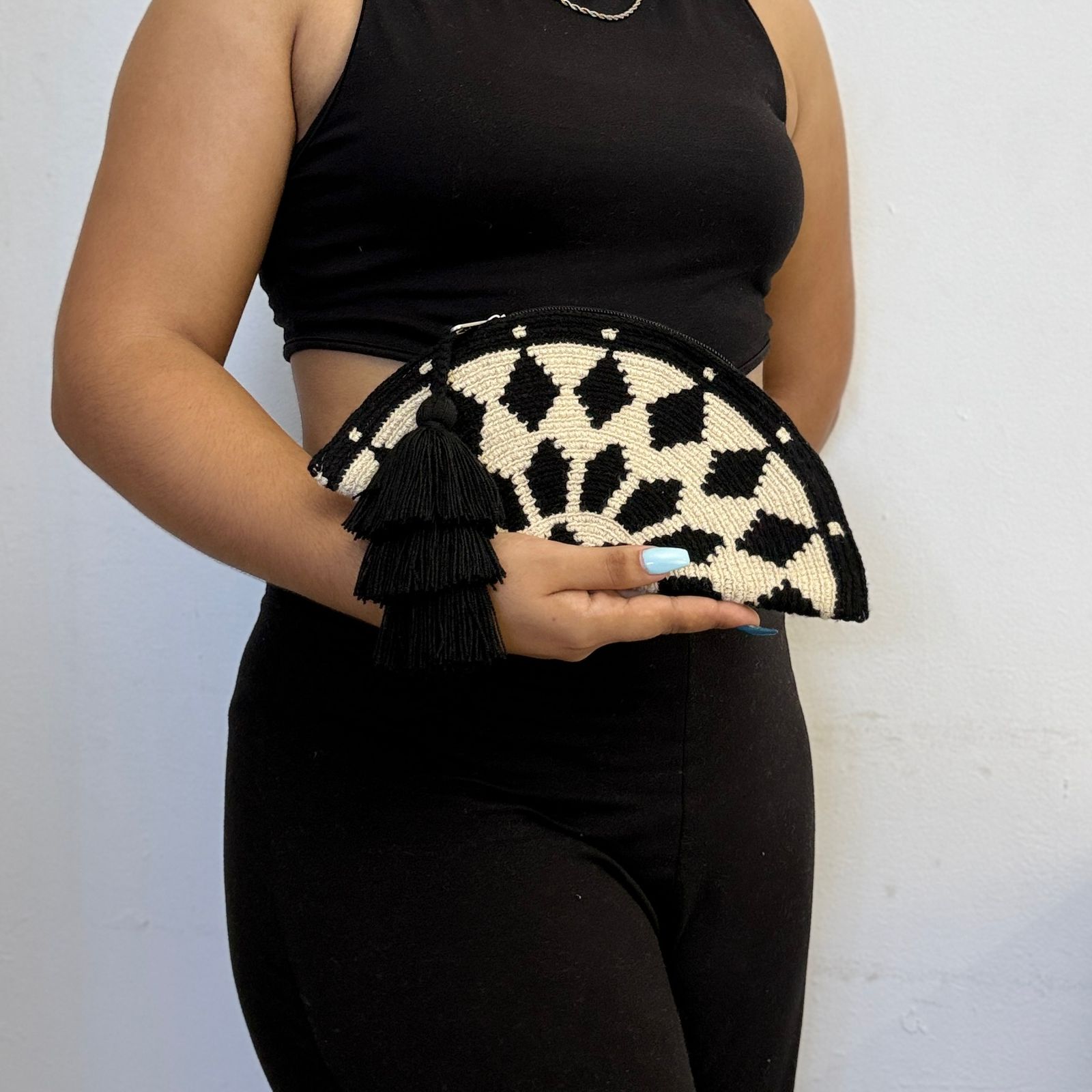 Cartera tejida artesanal Wayúu. Hecha a mano en la península de La Guajira por indígenas nativos. Producto 100% colombiano y patrimonio cultural de La Guajira. Sus creativos diseños y símbolos representan elementos propios de la naturaleza de la región.